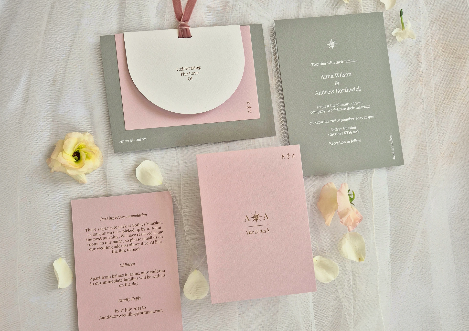 The Luna set includes an invitation and details card. The arched outer card ties the set together beautifully with ribbon. The invitation is supplied with a white envelope as standard, although heavyweight coloured envelopes and envelope liners are also available. To suit your requirements each element is sold individually.